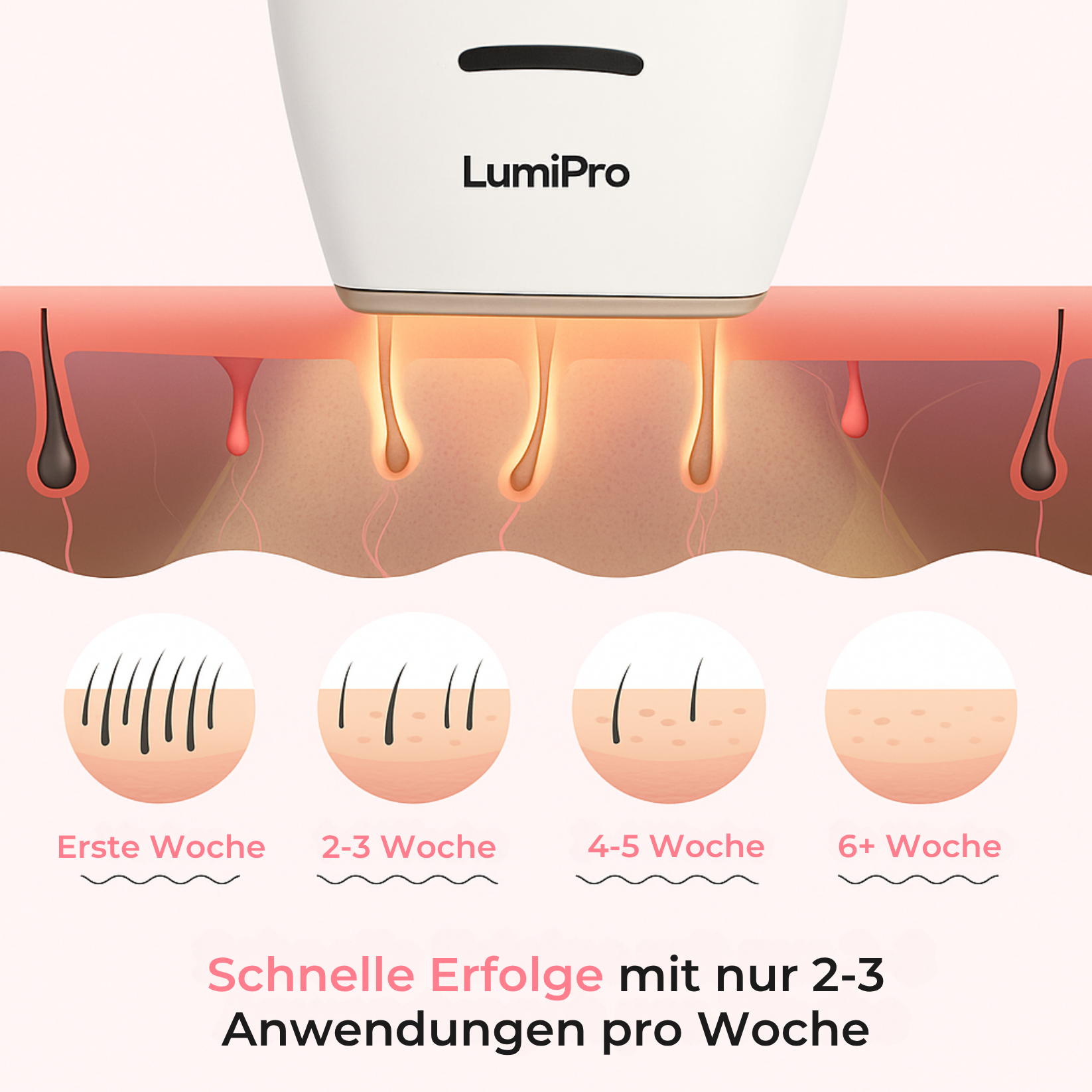LumiPro macht's möglich: In nur 5 Minuten pro Woche zu Hause zu seidig glatter Haut. Vergiss häufiges Rasieren und schmerzhaftes Waxing – bereits nach 3 Wochen siehst du klare Ergebnisse und nach 4 Wochen genießt du perfekte Glätte.